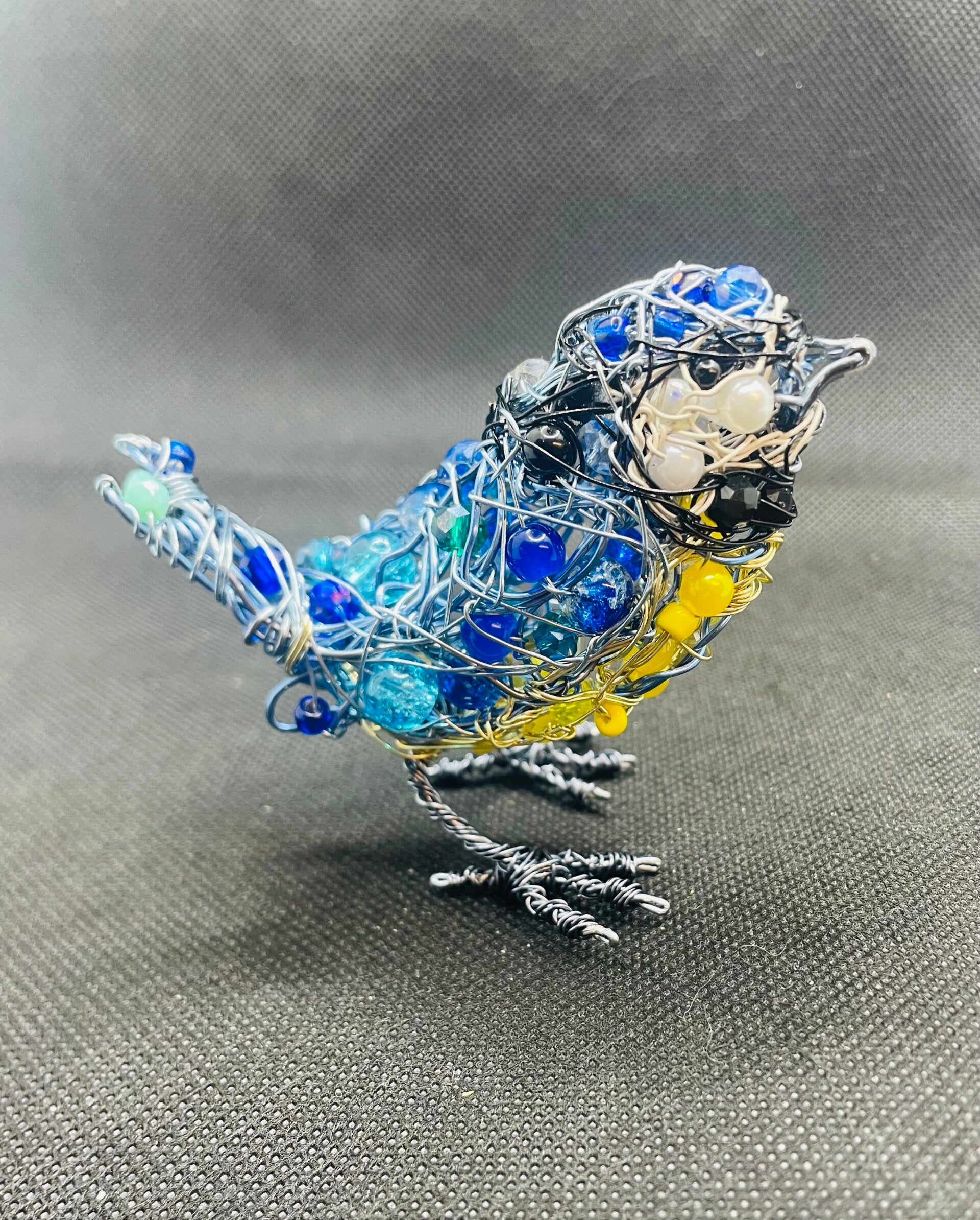 A free standing, three dimensional blue tit sculpture. It is handmade from wire and beads and is blue, yellow, white and black in colour. It is approximately 8cm by 8cm in size. Beads may vary from picture.