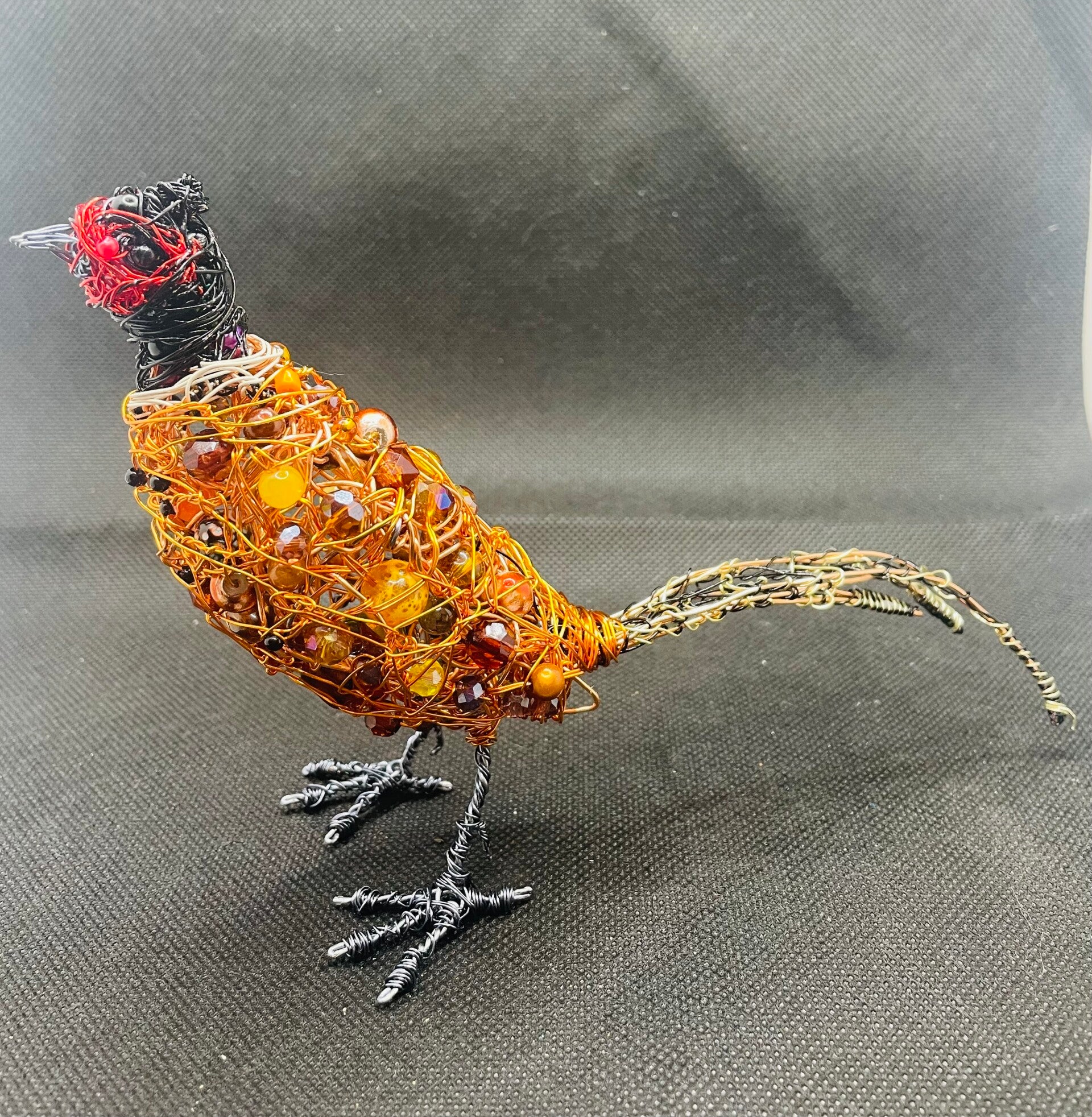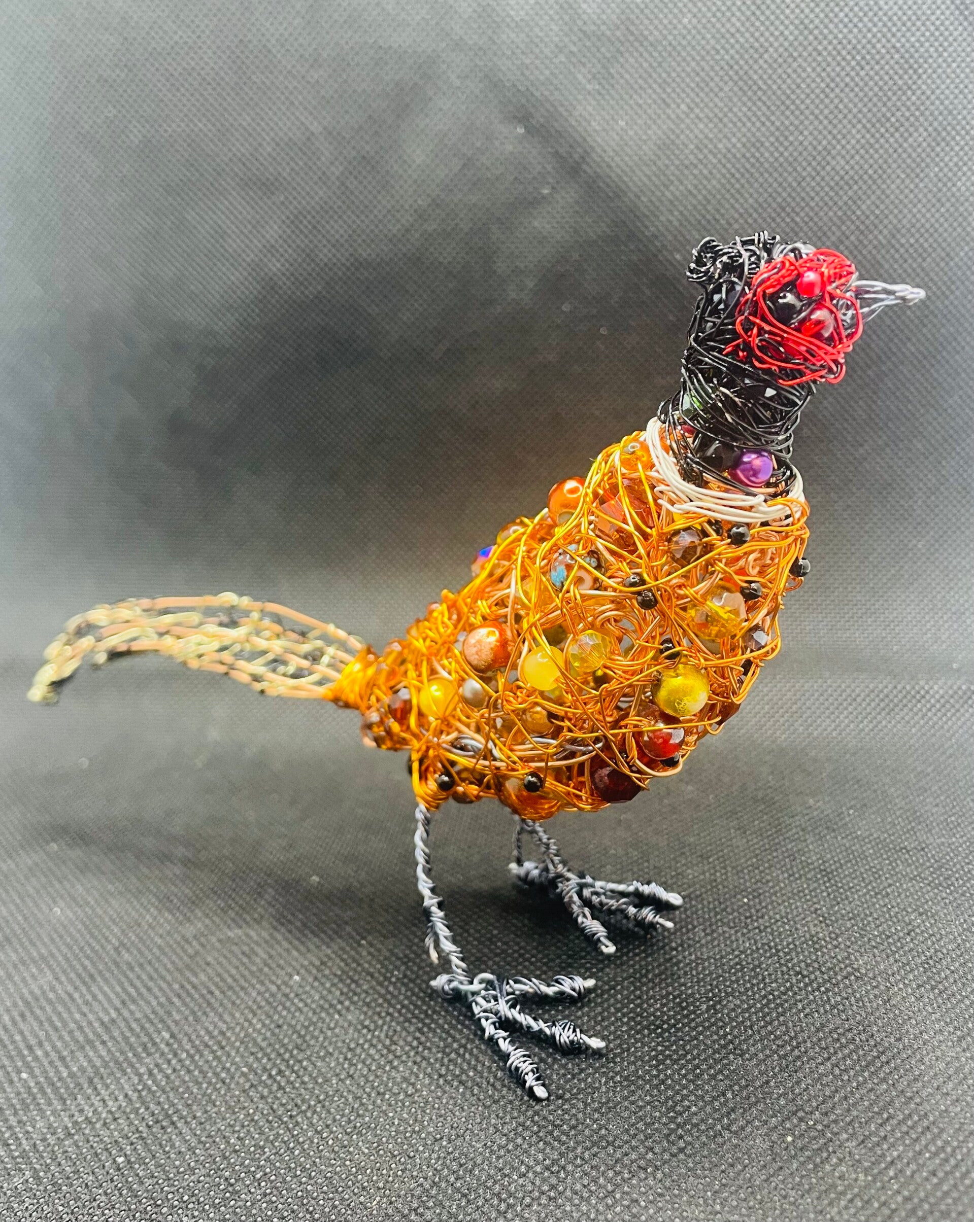 A theee dimensional free standing pheasant sculpture. It is handmade from wire and beads. It is brown, black red and gold and is approximately 12cm by 16cm. Beads may vary from the picture.
