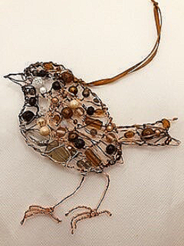A two-dimensional Sparrow (male bird) decoration, made from covered copper wire and glass beads. It has a brown satin ribbon for hanging and is brown, back, gold and white in colour. it's size is approximately 12cm by 13cm. The type of beads may vary from the picture.