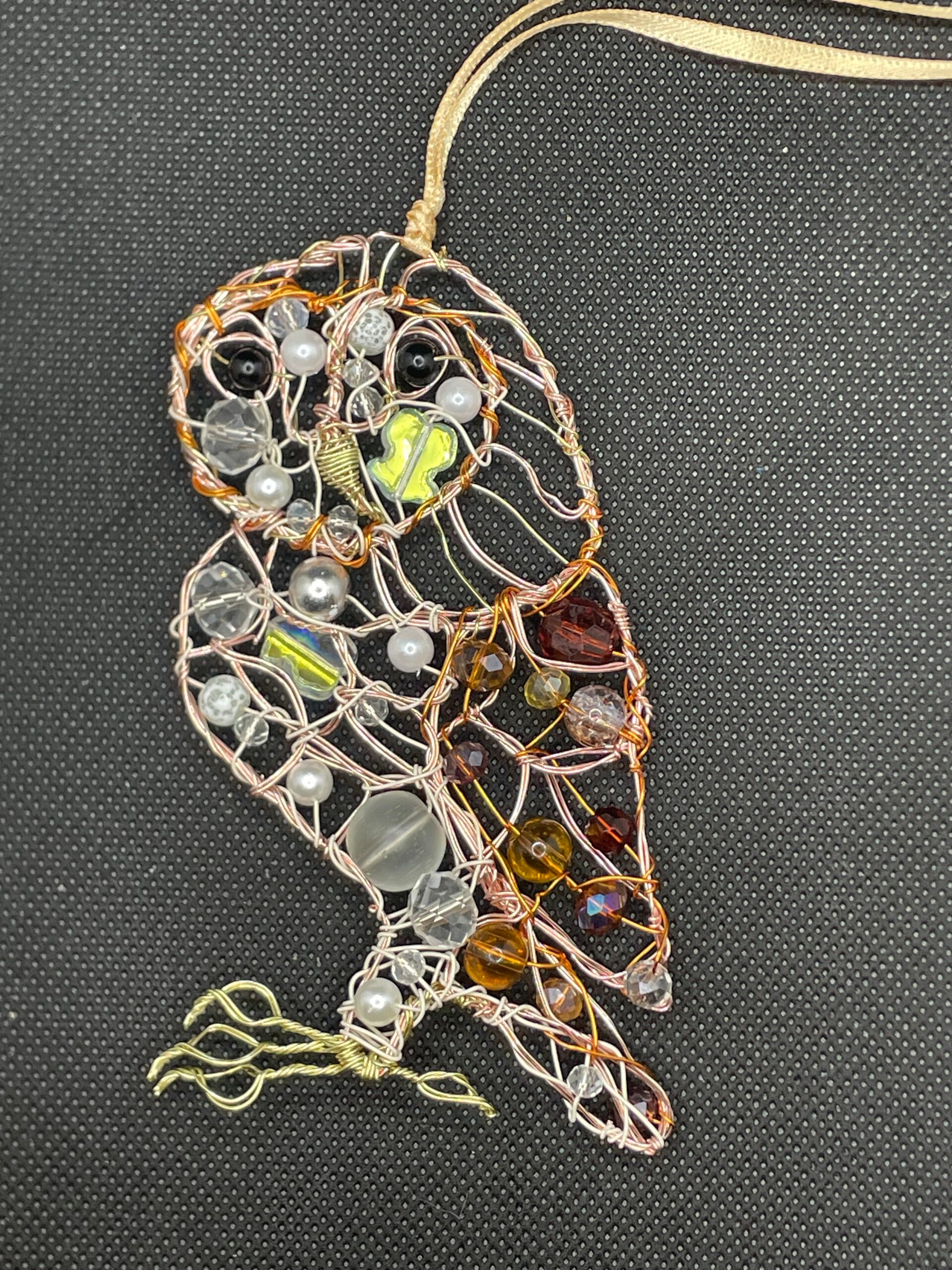 A two-dimensional barn owl decoration handmade from covered copper wire and beads, with a gold satin ribbon for hanging. It is brown, gold and white in colour. It's size is approximately 12 by 8cm. The beads may vary from the picture.