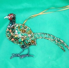 A two-dimensional pheasant decoration, handmade from covered copper wire and glass beads, with a brown satin ribbon for hanging. It is brown, gold, red, white and grey in colour. The size of the bird is approximately 14cm by 20cm. The beads may vary from the picture.