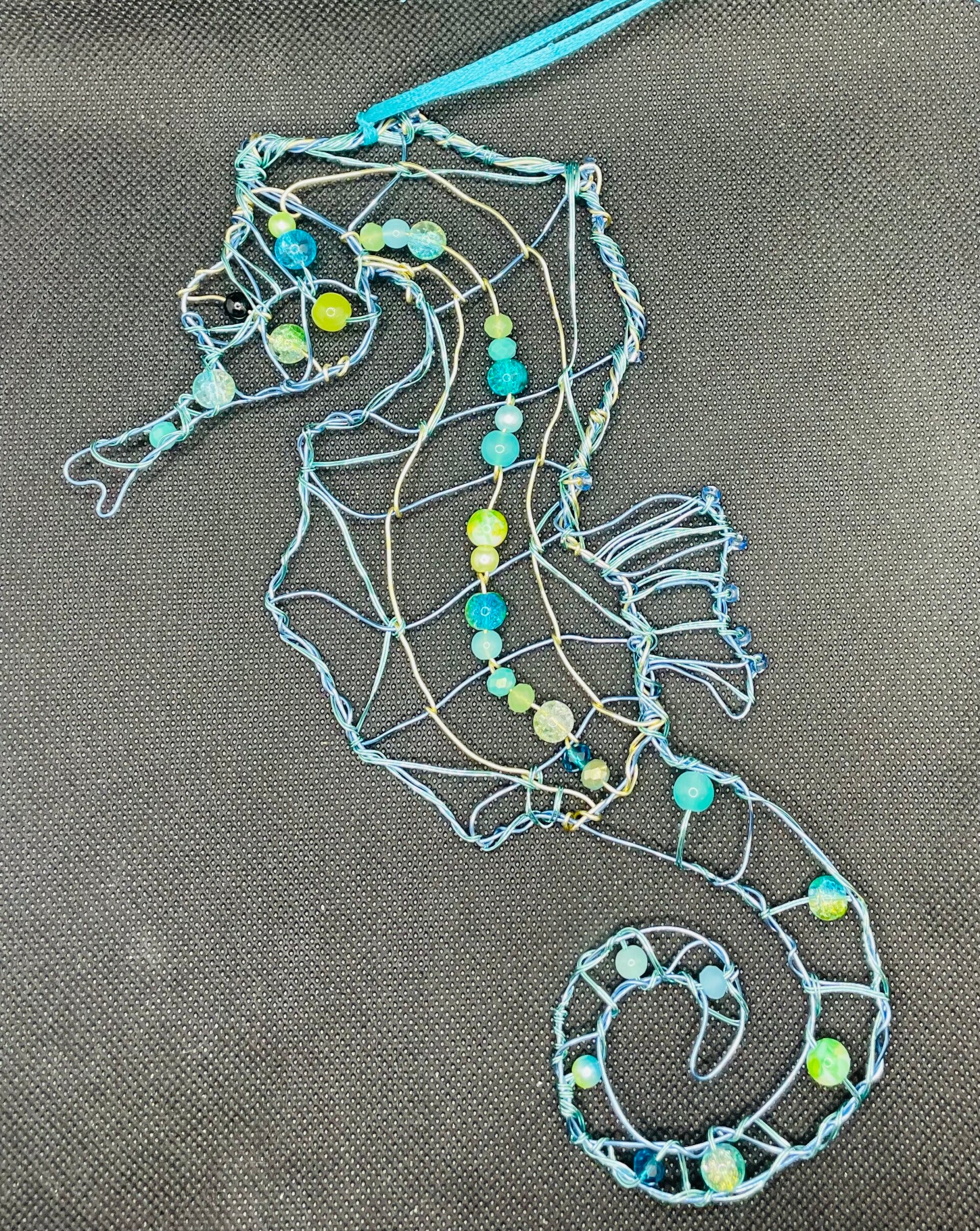 A two-dimensional seahorse decoration, handmade from covered copper wire and beads, with a ribbon for hanging. The seahorse multicoloured in greens and blues. it is approximately 23by 12cm. The beads may vary from the picture.
