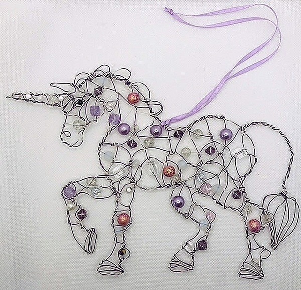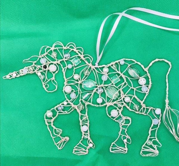 A two-dimensional unicorn decoration, handmade from covered copper wire and glass beads, with a satin ribbon for hanging. It comes in four colour options: pink/white, with a pink ribbon, blue/ white, with a blue ribbon, purple/white, with a purple ribbon or White/clear, with a white ribbon. It is approximately 16cm by 23cmin size. The beads may vary from the picture.