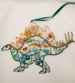 A two-dimensional stegosaurus decoration, handmade from covered copper wire and glass beads, with a satin ribbon for hanging. It comes in two colour options: Green/turquoise/orange, with a green ribbon or Light green/dark green, with a green ribbon. You can contact me to request alternative colour options. It is approximately 16cm by 23cm in size. The beads may vary from the picture.