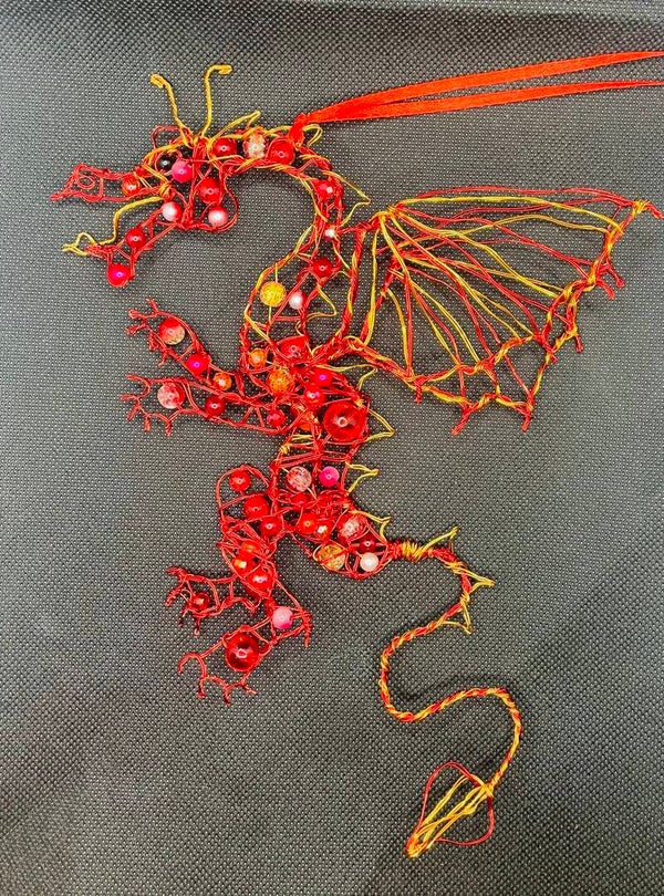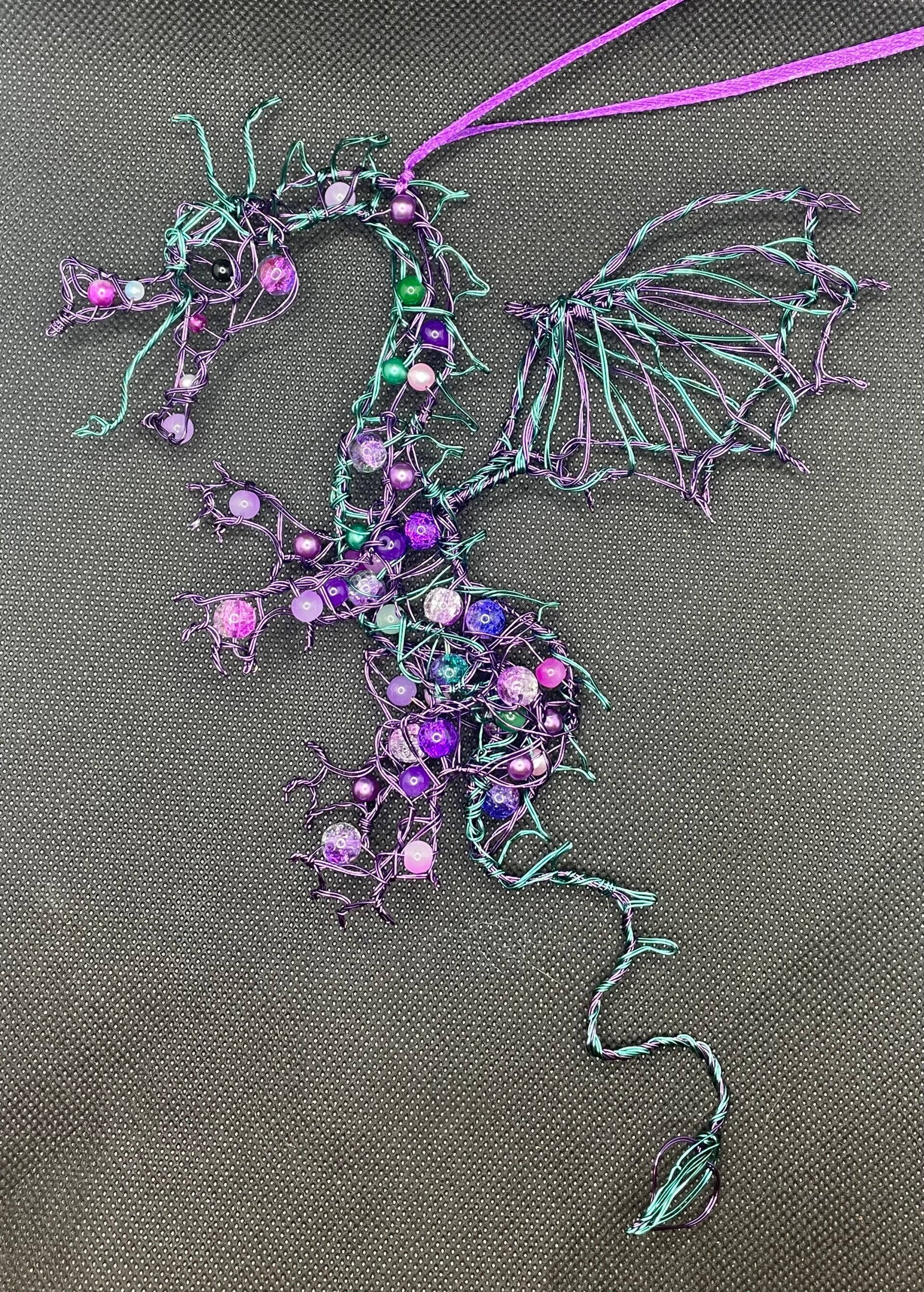 - A dragon decoration with three-dimensional elements. It is handmade from covered copper wire and glass beads, with a satin ribbon attached for hanging. It comes in three colour options: dark green/light green, with a green ribbon and red/gold, with a red ribbon and purple and gree. With a purple ribbon. It's size is approximately 28cm by 16cm. The beads may vary from the picture.