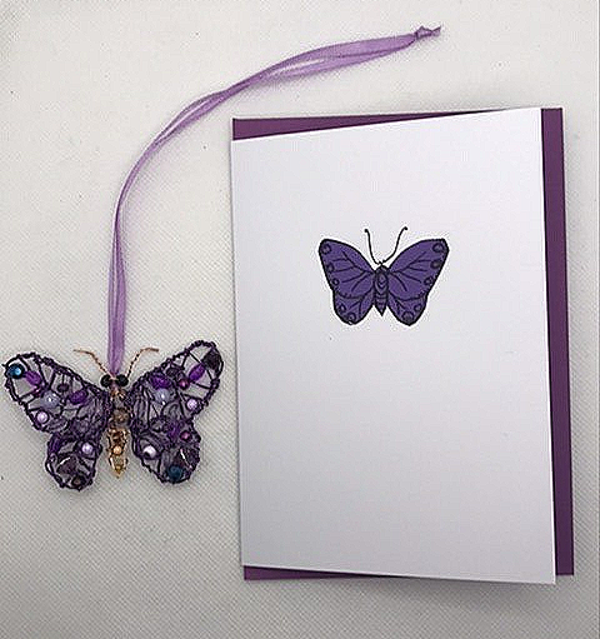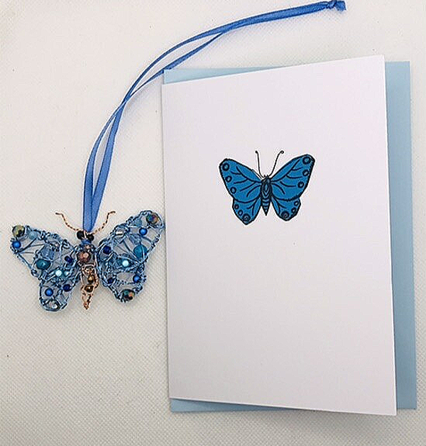 A greetings card that is a card and gift in one! The card is handmade with a butterfly design and comes with a detachable butterfly decoration. This is made from covered copper wire and glass beads and has a ribbon for hanging. The card is blank on the inside and comes with a matching coloured envelope, inside a cellophane pocket. It comes in three colour options: blue, pink or purple, with a matching envelope. The card is 148mm by 105mm and the size of the butterfly is approximately 5cm by 7cm. The beads may vary from the picture.