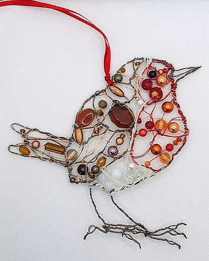 - A two-dimensional robin decoration, handmade from covered copper wire and glass beads, with a red satin ribbon for hanging. It is brown, red,orange and white in colour. It's size is approximately 12cm by 14cm. The beads may differ from the picture.