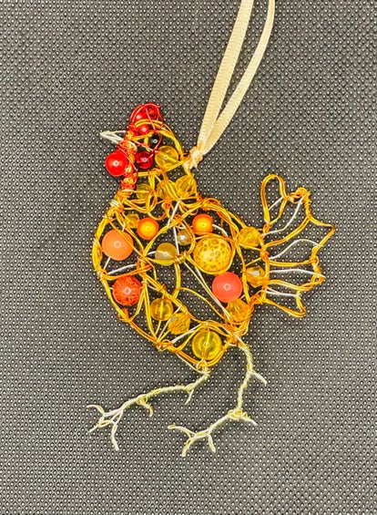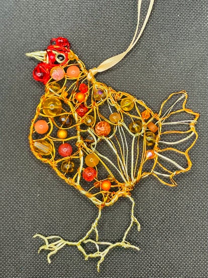A two-dimensional chicken decoration handmade from covered copper wire and glass beads, with a brown satin ribbon for hanging. It is orange, brown and red in colour. The bird is approximately 11cm by 13cm. The beads may vary from the picture.