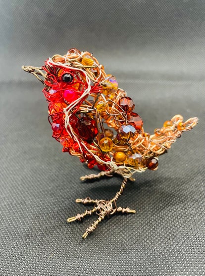 A three-dimensional, free standing robin sculpture, handmade from covered copper wire and beads. It is red, brown and white in colour. It's size is approximately 8cm by 8cm. The beads may vary from the picture.