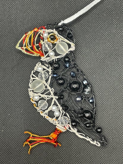 A two-dimensional Puffin decoration, handmade from covered copper wire and beads, with a grey satin ribbon for hanging. It is black, white, orange and red in colour. The size of the bird is approximately 10 by 13cm. The beads may vary from the picture.