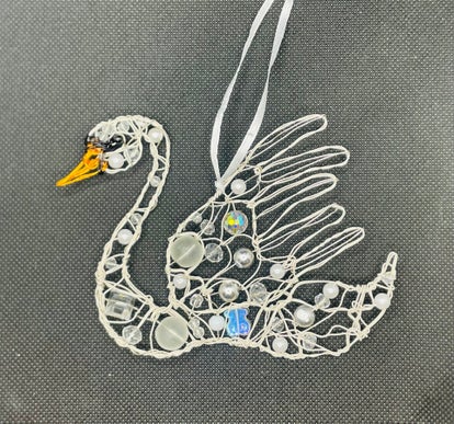 A two-dimensional Swan decoration, handmade from covered copper wire and beads, with a white satin ribbon for hanging. It is predominantly white in colour with black and yellow. It's size is approximately 10 by 12cm. The beads may vary from the picture.