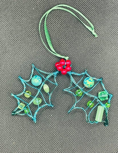 A holly and berries Christmas decoration handmade from wire and beads. It is approximately 7cm by 9cm and is red and green in colour. Beads may vary from the picture. Suitable for the Christmas tree. You can by one on its own or two for a discounted price.