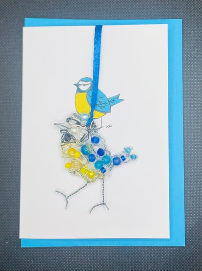 A blank greetings card with a blue tit design, that has been made by hand. It has a detachable blue tit decoration that has been made from wire and beads and is approximately 6cm by 6cm. The beads may vary from those in the picture. It has a blue satin ribbon and fits in a blue C6 envelope and comes in a cellophane pocket. The size of the card is 104mm by 149mm. It can be bought individually or as a pair for a discounted price.