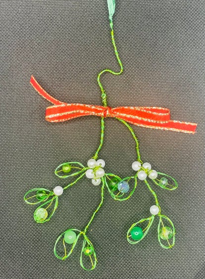 A mistletoe decoration, handmade from covered copper wire and glass beads. They have a gold edged satin ribbon for hanging, in either white or red. It is green and white in colour and it's size is approximately 15cm by 11cm. Suitable for the Christmas tree. Type of beads may vary from the picture.